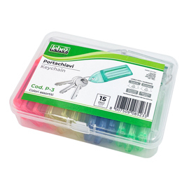 Scatola in plastica trasparente con 15 targhette portachiavi in plastica con anello in metallo. Colori assortiti trasparenti per una facile identificazione da ambo i lati.