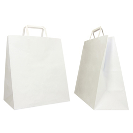 Shopper ideali per il trasporto di vassoi e contenitori alimentari realizzate con soffietti molto larghi dedicati a questo utilizzo. Dimensione 28x17x32cm. Colore bianco.