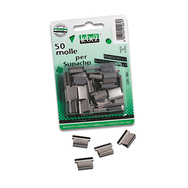 Molle di ricambio per Supaclip Lebez. Ogni molla rilega fino a 30 fogli da 80gr. Le molle sono diventate di molteplice uso sia in ufficio che a casa. Blister 50 molle in acciaio nere per sparamolle. Colore: Nero assortiti. Materiale: Metallo. Dimensione: 19mm. Peso confezione: 42gr. Confezione: 50 pezzi. Codice produttore: 1061. Marca Lebez.