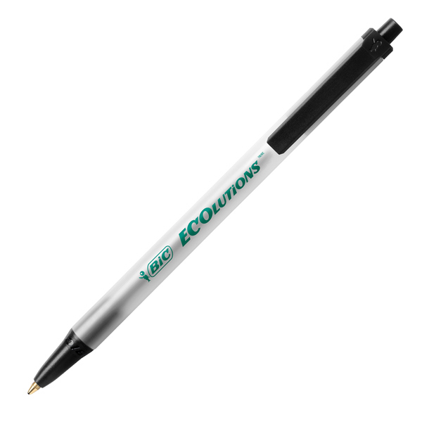 La penna a sfera ECOlutions nella versione a scatto, possiede il fusto tondo prodotto con 63% di materiale riciclato. Puntale e cappuccio/clip dello stesso colore dell'inchiostro. Tratto 1,0mm. Colore: nero. Confezione 50 pezzi.