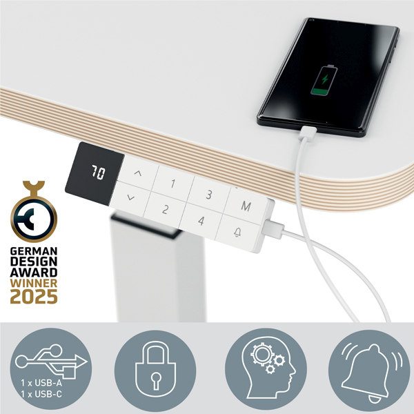 La scrivania e' progettata per un uso flessibile e come spazio di lavoro temporaneo, perfetto per l'home office e le aree di hot desking con funzione di memoria per regolare rapidamente 4 impostazioni di altezza preimpostate. 80 x 60 x 2,5 cm di scrivania con un carico massimo di 80 kg per contenere un monitor e un computer portatile con supporto, tastiera, mouse e poggiapolsi. Regolazione elettrica dell'altezza da 65 a 130 cm per adattarsi a tutte le esigenze, motore fluido con un discreto livello di rumore min. (> min. min. )>25db, protezione contro il surriscaldamento e funzione anticollisione. Pad di controllo di facile utilizzo con blocco per bambini, porte USB-C min. (>& min. )> USB Ada 5 V e schermo per la visualizzazione dell'altezza Include un vassoio per cavi che puo' essere fissato sotto la scrivania per contenere una presa di corrente e 4 clip autoadesive trasparenti per ridurre i grovigli di cavi.