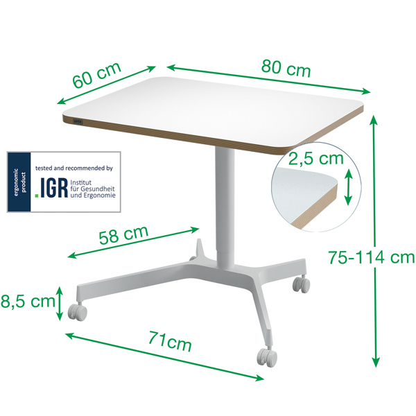 La scrivania e' progettata per un uso flessibile e come spazio di lavoro temporaneo, perfetto per l'home office, le aree di hot desking o le sale riunioni. Regolazione pneumatica assistita dell'altezza da 75 a 114 cm, facile da usare, per adattarsi a tutte le taglie e a tutte le esigenze.4 ruote bloccabili a 360 gradi adatte a tutti i tipi di pavimento (piastrelle, laminato, legno, moquette). 80 x 60 x 2,5 cm di superficie di appoggio con un carico massimo di 20 kg per contenere un computer portatile con supporto, tastiera, mouse e poggiapolsi. La scrivania e' progettata per un uso flessibile e come spazio di lavoro temporaneo, perfetto per l'home office, le aree di hot desking o le sale riunioni.