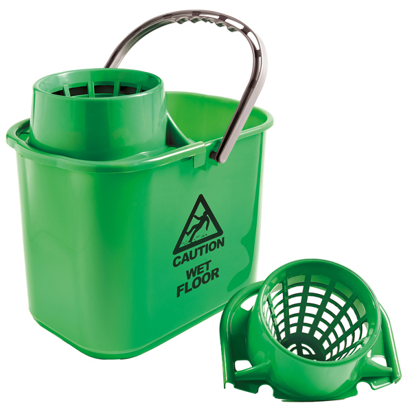Secchio con strizzatore capacita' 15L. Sistema colore per prevenire la contaminazione batterica tra diversi ambienti. Dimensioni: 30x27xH37cm .