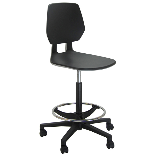 Seduta alta con schienale mendio e poggiapiedi regolabile. Sedile e schienale interamente in polipropilene sanificabile. Schienale fisso. Elevazione a gas. Base in nylon. Altezza totale: 103-128cm. Profondita' totale: 66cm. Altezza seduta: 58-83cm. Larghezza seduta: 45,5cm.