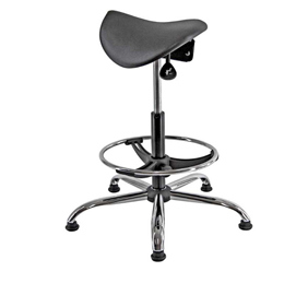 Particolare seduta a "sella'' con meccanismo sincronizzato oscillante permettono un utilizzo prolungato per chi necessita di una postura ''ritto in piedi''. Struttura in acciaio cromato e sedile in poliuretano integrale autopellante. Poggiapiedi telescopico. Dotato di piedini in gomma antiscivolo. Elevazione a gas.