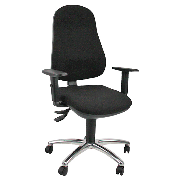 Seduta operativa con schienale alto con sagomature lombari. Meccanismo sincronizzato a 2 leve per la regolazione in altezza del sedile e schienale. Rivestimento in tessuto ECO. Elevazione a gas e base cromata con ruote. Braccioli regolabili.