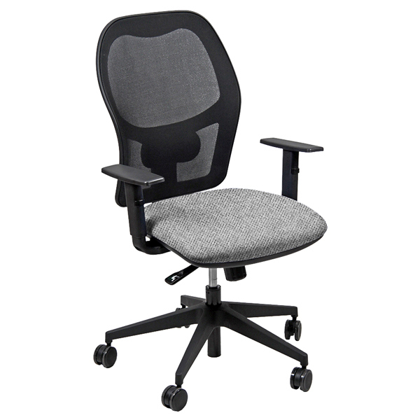 Seduta operativa girevole con elevazione a gas, meccanismo syncro, 4 blocchi anti shock e meccanismo a contatto permanente. Schienale con supporto lombare regolabile. Completa di braccioli regolabili. Rivestimento in tessuto Eco 100% polipropilene. Alt.tot: 102-113cm; Prof. Tot: 68cm; Alt.schienale: 60cm; Largh.schienale: 48cm; Largh.sedile: 48cm; Prof.sedile: 46cm; Alt.sedile: 42-54cm.