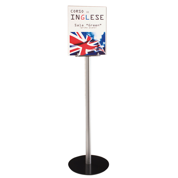 Supporto in alluminio per segnaletica da pavimento, con base in metallo colore grigio canna di fucile e porta avvisi in metacrilato. Dimensioni gradi 32 x 138cm.