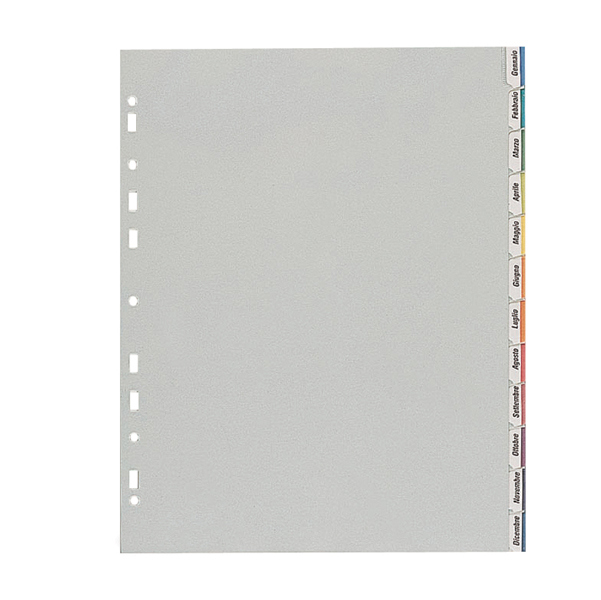 Divisori realizzati in polipropilene di coloregrigio da 120 micron. Dotati di 12 tacche neutre e di un cartoncino stampato e fustellato per la personalizzazione delle tacche. Foratura universale. Formato esterno 24,2x30,5cm. Formato interno 22x30cm. Made in Germany.
