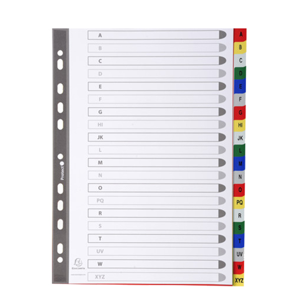 Divisori con 20 tasti alfabetici A-Z, ideale per organizzare e archiviare informazioni importanti, appunti o documenti scolastici, per l'uso a casa, a scuola o in ufficio. Polipropilene colorato 120 micron. Frontespizio stampabile per identificazione del contenuto. Tasti prestampati dalla A alla Z per dividere in ordine alfabetico. Perforazione universale per una facile archiviazione in tutti i tipi di raccoglitori. Per formato A4.