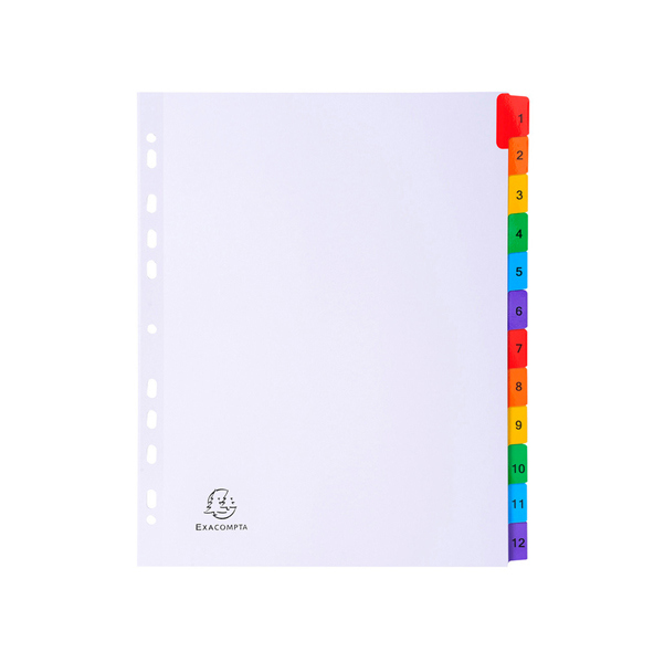 Intercalari numerici (1-12) in cartoncino bianco da 160 gr. Dotati di 12 tacche multicolore plastificate. Indice frontale stampabile. Foratura universale. Banda di perforazione e tasti rinforzati. Formato esterno: 24,5x29,7 cm.