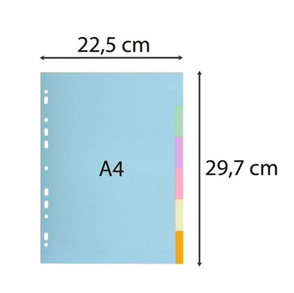 Marchio exacompta. Sono ideali per l'organizzazione dei tuoi documenti personali e professionali. Materiale cartoncino. Spessore 3/10e. Dimensione prodotto 22,5x29,7cm. Cartoncino in fibre riciclate. Formato utile A4. Tipo di prodotto intercalari. Tipo neutro. Grammatura 170gr. Tipologia intercalari neutri. Tasti neutri. Multicolore. Formato A4 (21x29,7cm). Numero tasti 6. Colori assortiti. Materiale cartoncino riciclato.