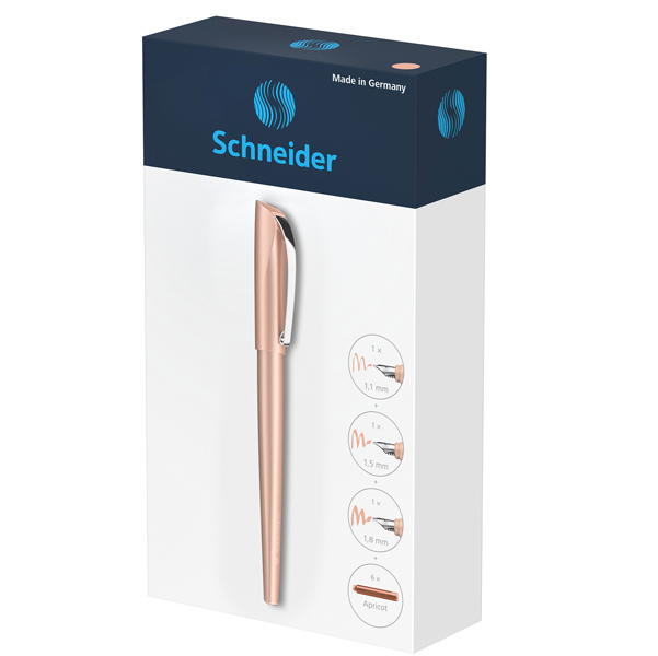 Penna stilografica calligrafica con elegante look metalizzato, impugnatura ergonomica gommata. Utilizzabile con cartucce standard o converter. Confezione regalo contenente: 1 stilo con 3 punte intercambiabili (1,1 - 1,5 - 1,8mm). Incluso nella confezione 6 cartucce ricambio colore APRICOT PASTEL.