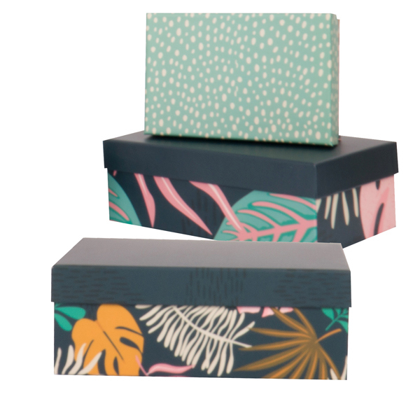 Robuste e colorate scatole in cartone spessore 2mm. Rivestite in carta da 170gr/m2 stampata in offset e incollata a caldo. Il set e' composto da 5 scatole, una per ogni misura: 14x21x6cm, 16x23x7cm, 17x24x8cm, 18,5x25x5x9cm, 20x27x10cm.