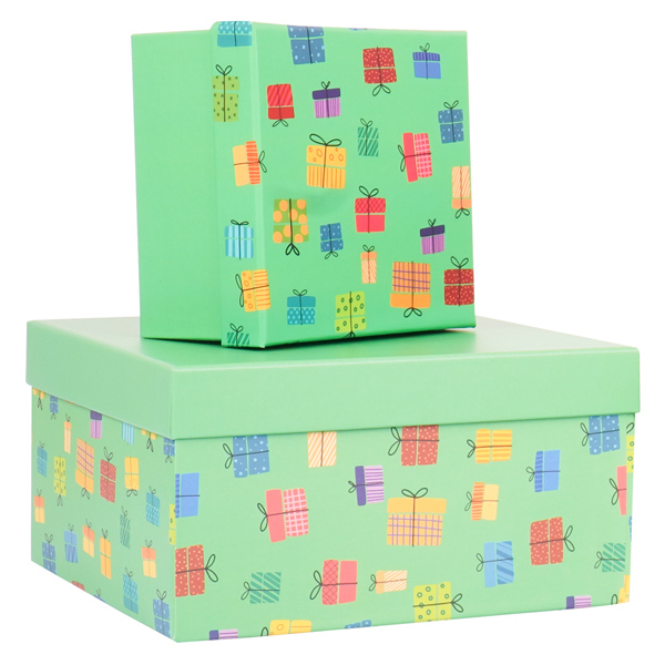 Robuste e colorate scatole in cartone spessore 2mm. Rivestite in carta da 170gr/m2 stampata in offset e incollata a caldo. Il set e' composto da 6 scatole, una per ogni misura: 12x12x6cm, 14x14x8cm, 16x16x9cm, 18x18x10cm, 20x20x11cm, 22x22x12cm.