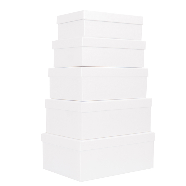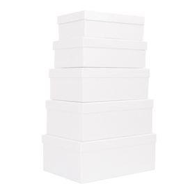 Robuste e colorate scatole in cartone spessore 2mm. Rivestite in carta da 170gr/m2 stampata in offset e incollata a caldo. Il set e' composto da 5 scatole, una per ogni misura: 14x21x6cm, 16x23x7cm, 17x24x8cm, 18,5x25x5x9cm, 20x27x10cm.