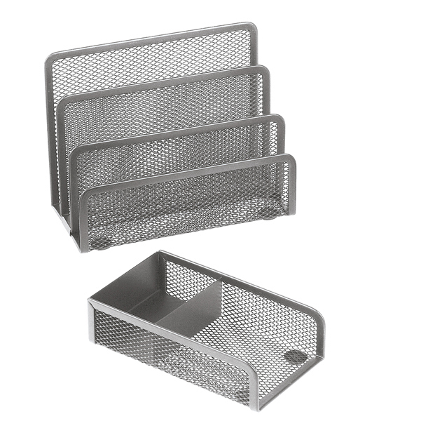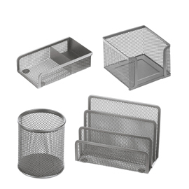 Set scrivania in rete metallica, composto da 4 accessori: sparticarte, cubo portamemo, portapenne e portafermagli.