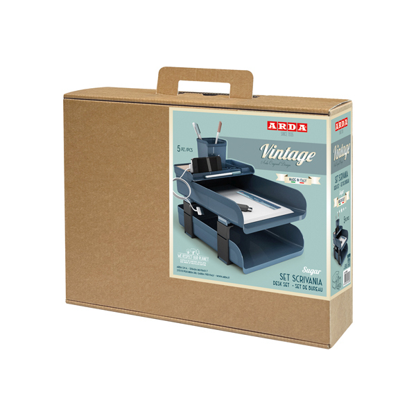 Set scrivania vintage pratico e utile per la scrivania. Contiene il necessario per organizzare carte e accessori: 2 portacorrispondenza con distanziali - 1 bacinella - 1 portapenne - 1 righello cm. 16. 3 colori disponibili: azzurro sugar - ocra caramel- avorio milk.