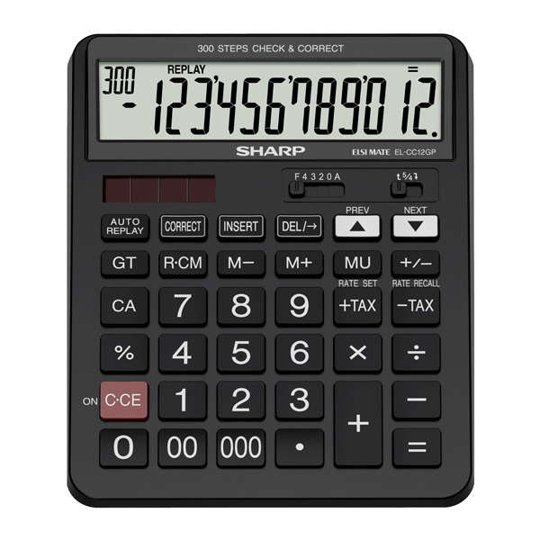 funzione: grande display inclinato a 12 cifre; doppia alimentazione (batteria e solare); separatore ogni 3 cifre -3 tasti memoria; tasto doppio/triplo zero (00/000), tasto correzione; calcolo delle imposte (tax +/-) -gran totale (gt); premio/sconto (mu); funzione di ripristino; funzione check min. (>& min. )> correct (300 passi) ulteriori informazioni: batteria (utilizzo di back-up): lr44 x 1; dimensioni (mm): 198 x 158 x 32; peso (g): 240.