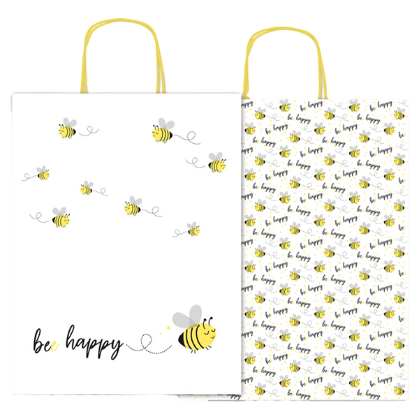 Shopper regalo realizzato in carta kraft bianco con stampe a colori. Dotato di manici in carta ritorta. Assortimento di 5 differente fantasie.