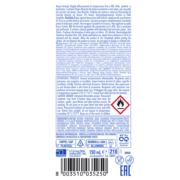 Freschezza Talcata Breeze, questo deodorante spray aiuta a regolare efficacemente la traspirazione per 48h, proteggendo delicatamente la pelle. La formula innovativa include Polveri Minerali con proprieta' assorbenti e deodoranti, garantendo una pelle piu' asciutta nel tempo. E' adatta anche per le pelli sensibili e dopo la depilazione. Lo Spray Breeze aiuta a ridurre la formazione di macchie bianche sui tessuti. Capacita' 150ml. 0% di alcool. Marca Mirato Breeze.