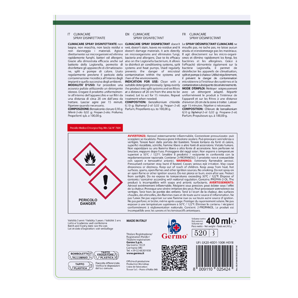 Spray disinfettante per apparecchi di climatizzazione. Presidio Medico Chirurgico attivo su Legionella, batteri ed i funghi. Appositamente formulato per la disinfezione di apparecchi di climatizzazione, split e pompe di calore, esso agisce direttamente sui microrganismi responsabili di numerose patologie respiratorie. Usato regolarmente previene il pericolo della contaminazione microbica all'interno dell'impianto e quella successiva degli ambienti. Non danneggia i materiali - plastica - resine - metalli - collanti speciali. Non macchia. Attivo sulla famiglia dei Coronavirus. Test eseguiti da laboratorio EU accreditato. Bombola da 400 ml.