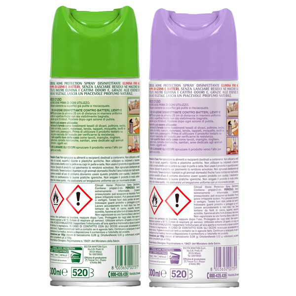 Citrosil Home Protection spray disinfettante elimina fino al 99,99% di germi e batteri da tutti i tessuti d'arredo e dalle superfici difficili da lavare.Formula PMC con azione virucida completa. Grazie alla sua fine nebulizzazione agisce in un solo gesto, senza lasciare macchie sui tessuti. Elimina i cattivi odori e, grazie alle essenze di origine vegetale, lascia un piacevole profumo. - Elimina germi, batteri, lieviti e muffe -Elimina i cattivi odori, lasciando un piacevole profumo - Zero macchie sui tessuti - Disinfetta tutti i tessuti d'arredo (come tende, tappeti, moquette) e le superfici morbide (come divani, poltrone, cuscini, materassi, testate del letto, passeggini, peluche). Utile anche per gli interni dell'auto (tappetini, sedili, seggiolini per bambini) - Disinfetta le superfici dure (come tavoli, maniglie, ringhiere, pattumiere, cornette telefoniche, sanitari, aree dedicate agli animali domestici, giocattoli, oggetti vari).