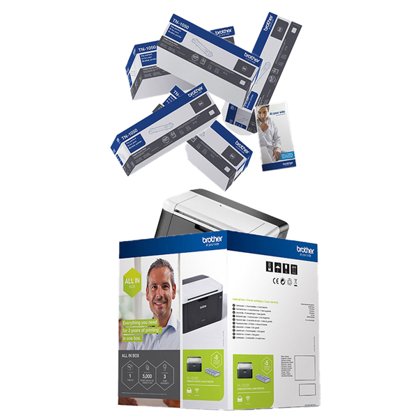 Stampante laser monocromatica compatta con WiFi; stampa da app e connettivita' wireless. Design super compatto Con l'All In Box hai 3 anni di scorta di toner e 3 anni di garanzia. Stampa semplice, affidabile e di qualita' con toner e garanzia inclusi per 3 anni. - 5 cartucce toner trasparenti incluse nella confezione. Velocita' di stampa: fino a 20 ppm. Connettivita' semplice via Wifi e USB 2.0.