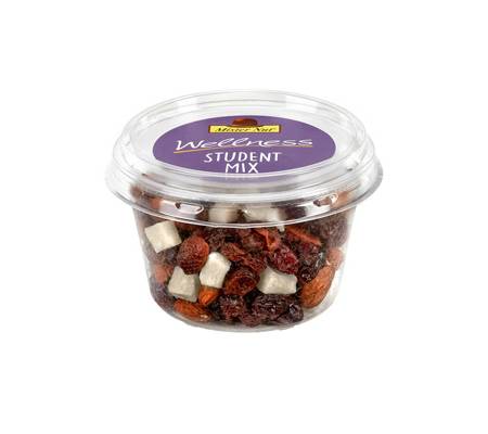 Miscela di semi e frutta secca (Mirtilli rossi + uva sultanina + Mandorle Sguc. + Cocco a cubetti) in pratico bicchiere in plastica R-PET trasparente. Ingredienti: Mirtilli rossi disidratati e zuccherati (mirtilli 66%, zucchero di canna, olio di semi di girasole), Uva sultanina disidratata (uva 99%, olio di semi di girasole), Mandorle sgusciate, Cocco a cubetti disidratato e zuccherato (cocco 50%, zucchero, conservante: anidride solforosa (E220). Puo' contenere arachidi, anacardi, noci, nocciole, pistacchi.