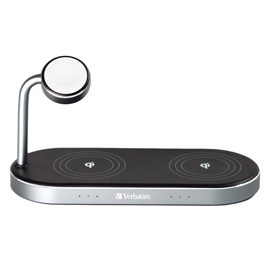 La stazione di ricarica 3-in-1 di Verbatim consente di caricare tutti i tuoi dispositivi contemporaneamente senza fili. Ricarica in modalita' wireless l'Apple Watch e due iPhone (8 o successivo) o altri dispositivi abilitati alla ricarica wireless certi ficati Qi. Nessun cavo fastidioso! e' sufficiente posizionare ogni dispositivo nel suo spazio designato e la ricarica inizia al momento del contatto.