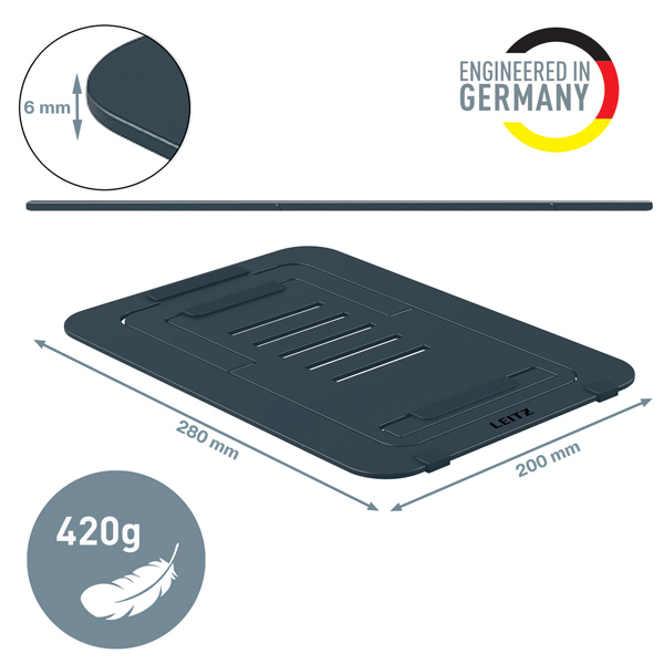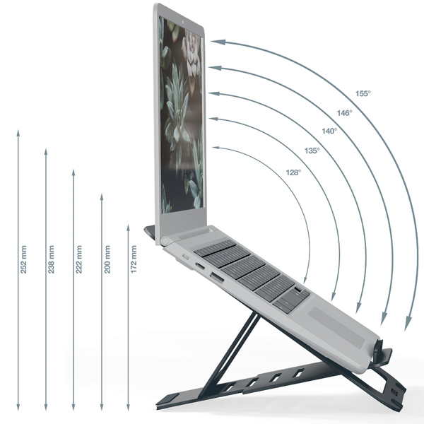 Supporto per laptop in alluminio, robusto e durevole, dal design ergonomico, per massimizzare il comfort sul posto di lavoro o in vi aggio. Solleva lo schermo del laptop dal tavolo per aumentare il comfort e contribuire a migliorare la postura mentre si e' seduti o in piedi, per una migliore salute generale e per favorire il lavoro attivo. Ultra piatto con SlimLift Design (SLD) che rende il rialzo regolabile per laptop facile da usare in qualsiasi spazio a casa, in ufficio o in viaggio. Regolazione facile e veloce per creare l'angolo di visione perfetto, selezionando una delle 5 diverse impostazioni di altezza. Adatto per laptop e tablet da 10 a 17 pollici (I MacBook che si aprono a un massimo di 135 gradi possono essere utilizzati con l'impostazione di altezza di 172 mm e 200 mm). Garantisce la ventilazione del computer portatile favorendo il flusso d'aria per mantenere la batteria e gli altri componenti freschi. Sicuro e stabile grazie al gancio pieghevole ultrapiatto e agli elementi in gomma sulla base per evitare che il supporto per laptop scivoli. Design leggero e ultra sottile (6 mm) per essere facilmente riposto in una borsa per lavorare in mobilita' o per essere conservato. Viene fornito con una custodia in cotone per proteggere il supporto pieghevole per laptop quando non viene utilizzato. Imballaggio privo di plastica e a fine vita riciclabile al 100% quando viene completamente smontato nei diversi tipi di materiale. Testato e raccomandato dall'Istituto tedesco IGR per la salute e l'ergonomia, secondo la norma DIN 26800 EN ISO 15537. Dimensioni:300 x 10 x 210.