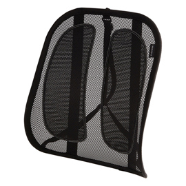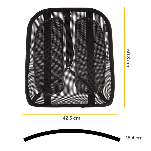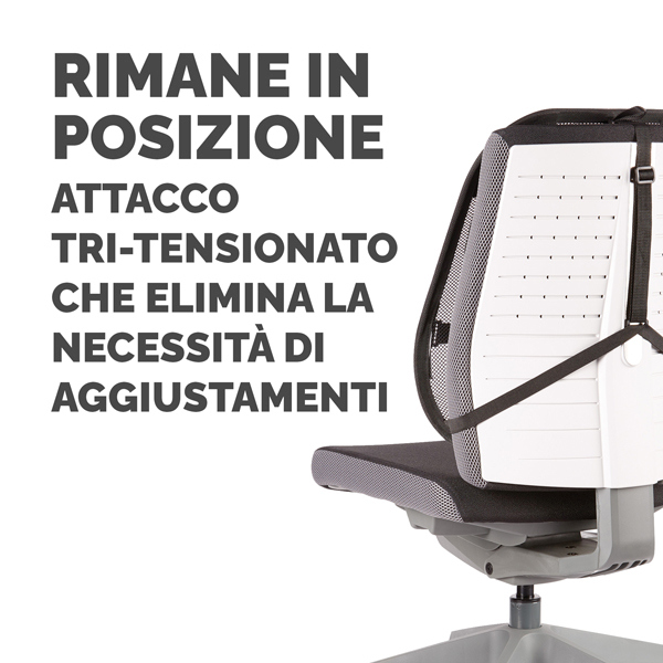 In tessuto a rete con inserti di rinforzo, si adatta alla forma del corpo. Sistema di ancoraggio tri-tensioning per elimnare la necessita' di continui aggiustamenti, facilmente adattabile alla sedia. Dimensione 50x45x20cm.