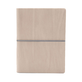 Taccuino con copertina in sintetico effetto liscio. Morbida, resistente e flessibile. Chiusura con elastico orizzontale. Carta riciclata colore avorio. Fatto a mano in Italia.
