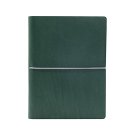 Taccuino con copertina in sintetico effetto liscio. Morbida, resistente e flessibile. Chiusura con elastico orizzontale. Carta riciclata colore avorio. Fatto a mano in Italia.