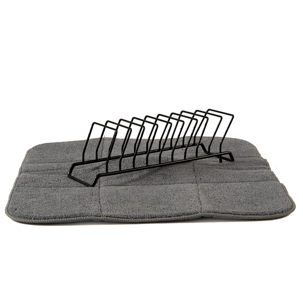 Tappetino in microfibra e griglia metallo a 9 posti pratico, intelligente, indispensabile per il piano cucina. Perfetto per piatti e altre stoviglie, il tappetino e' lavabile in lavatrice a 30 gradi. Panno: 400x500mm. Griglia: 270x85xh90mm.
