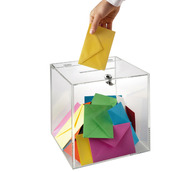 Contenitore ad urna in materiale acrilico altamente trasparente. Dotato di fessura sul lato superiore e chiusura di sicurezza con serratura e chiave. Ideale come contenitore da banco per la raccolta di suggerimenti, come espositore e complemento d'arredo per negozi e vetrine. Dimensioni: 25x25x25cm. La fessura e' larga 12,5cm. Colore trasparente. Materiale acrilico. Tipologia teca con serratura. Dimensione 25x25x25cm.