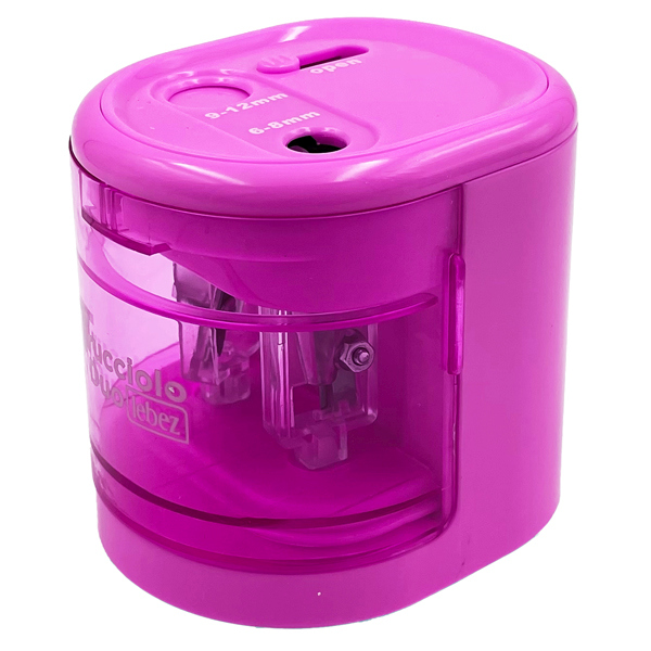 Temperamatite a 2 fori per matita fino a diametro 12mm. Funziona con 4 pile AA non incluse. Colori assortiti (blu, rosso, giallo, verde).