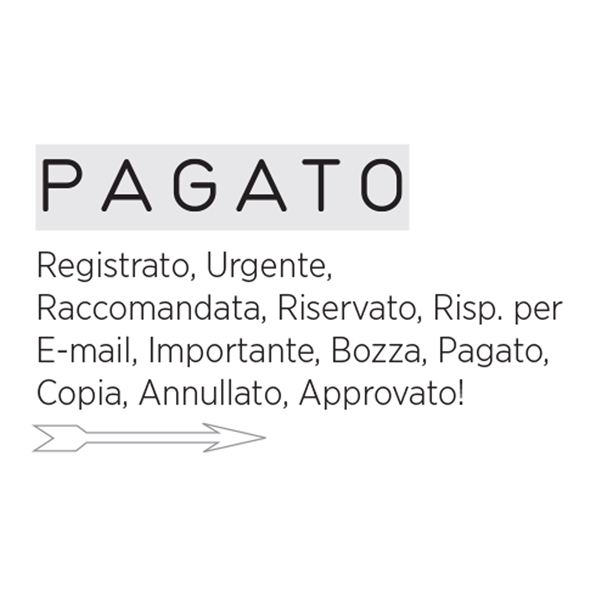 Timbro mini polinomio S120/W autoinchiostrante. 12 diciture con caretteri alti 4mm. REGISTRATO, URGENTE, RACCOMANDATA, RISERVATO, RISP.per E-mail, IMPORTANTE, NON TRASFERIBILE, PAGATO, COPIA, ANNULLATO.