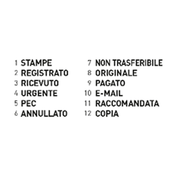 Timbro polinome con 12 diciture: STAMPE, REGISTRATO, RICEVUTO, URGENTE ,VIA AEREA, ANNULLATO, NON TRASFERIBILE, ORIGINALE, PAGATO, FAXATO, RACCOMANDATA, COPIA. Altezza carattere 4mm. tampone inchiostro 6/4911.