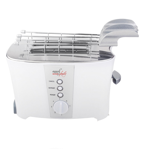 Tostapane elettrico con doppia pinza, termostato regolabile, tasto scongelamento. Timer con espulsione automatica delle pinze. Tasto riscaldamento. Vassoio raccoglibriciole. Alimentazione: 220-240V 50Hz. Potenza 600W. Dimensioni: 27 x 26 x 17,2 cm.