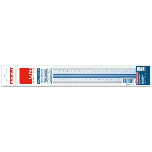 Triplodecimetro Uni da 30cm con impugnatura lunga Arda. Triplodecimetro con impugnatura lunga in materia plastica termoresistente di grande trasparenza e durezza superficiale, colore fume' ottico. Gradazione incisa a caldo dei numeri e dei millimetri per garantire precisione e indelebilita'. Materiale termoresistente. Colore: trasparente. Materiale: plastica. Tipologia prodotto: triplodecimetri. Lunghezza completa: 32,1cm. Peso: 41gr. In busta self service. Codice produttore: 50130SS. Marca Arda.