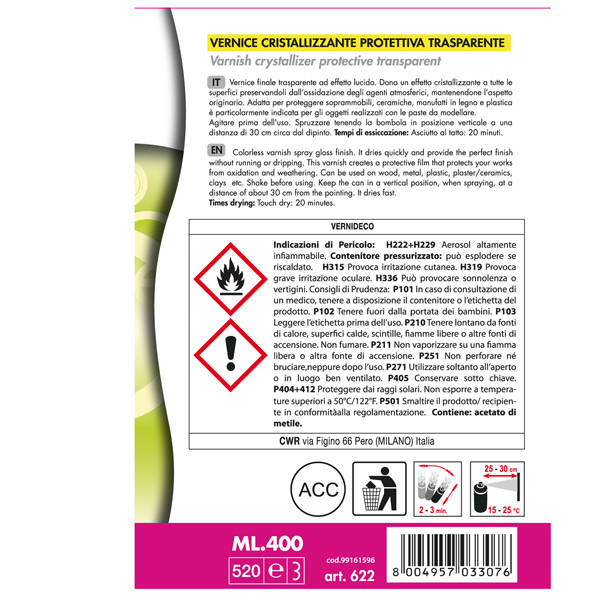 Vernice in spray cristallizzante trasparente che dona agli oggetti un effetto laccato e ceramico. Non ingiallisce nel tempo. Molto resistente alla luce e agli agenti atmosferici. Aderisce tenacemente ad ogni tipo di supporto (carta, tela, ceramica, porcellana, pasta di sale, argilla, creta, vetro, metallo, plastica, ecc) si utilizza semplicemente spruzzando sull'oggetto conferendo un aspetto brillante, lucido ed omogeneo. Conforme alle normative cee sulla sicurezza. La vernice spray cristallizzante trasparente deco è un prodotto innovativo che trasforma qualsiasi oggetto in una creazione dal look laccato e ceramico. Questa vernice è ideale per chiunque desideri dare nuova vita a oggetti comuni o realizzare progetti artistici unici. Con una semplice applicazione, la vernice spray cristallizzante trasparente dona un aspetto raffinato e professionale a una vasta gamma di superfici. progettata per essere facile da usare e incredibilmente versatile. Ideale per artigiani, hobbisti e professionisti, questa vernice può essere applicata su diversi tipi di materiali, inclusi metallo, plastica, vetro e ceramica. Con la sua finitura cristallizzante, ogni oggetto trattato acquisisce un aspetto lucido e raffinato che imita la ceramica laccata.