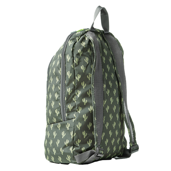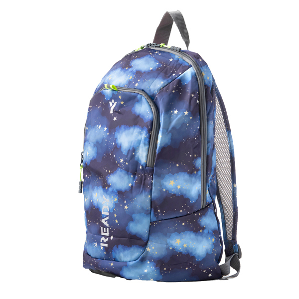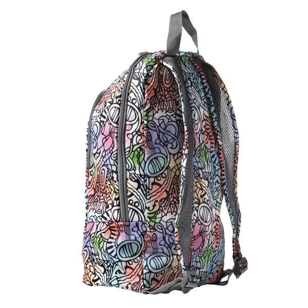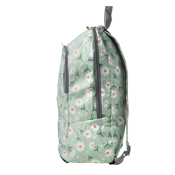 Zaino ripiegabile in resistente tela. Dotato di spallacci traspiranti e tasca esterna multiuso. 12 fantasie assortite. Dimensioni 28x44x15cm.