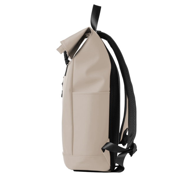 Zaino Roll-top realizzato con materiale gommato resistente all'acqua e idrorepellente. Dotato di grande vano centrale e tasce laterali. Chiusura superiore con zip e moschettone. Incluso guscio porta notebook 15''.